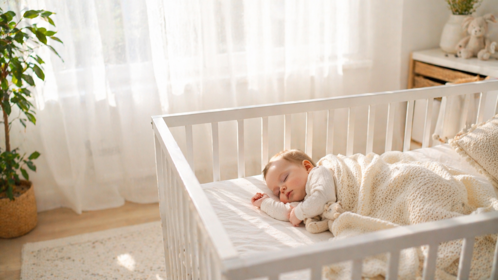 Pasul 5 — Așteaptă câteva minute înainte să intervii. Mulți bebeluși scâncesc ușor în tranziția spre somn și se liniștesc singuri. Dacă sari imediat la primul sunet, riști să îl trezești complet.